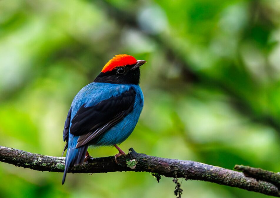 Mede cerca de 14 cm, e o macho se destaca pela sua colocação, que apresenta asas e cabeça pretos, com exceção do topo da cabeça que é vermelha, e o restante do corpo azul, e a fêmea possui o corpo todo com a cor verde-oliva.